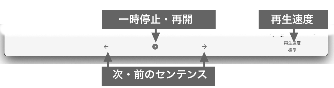 音声読み上げボタンをクリックすると表示中のページから音声読み上げを開始します。音声読み上げ中はユーザ操作によるページ切り替えが一切行えなくなります。また、画面下部に表示されるインターフェースも音声読み上げ用のものに変わります。
