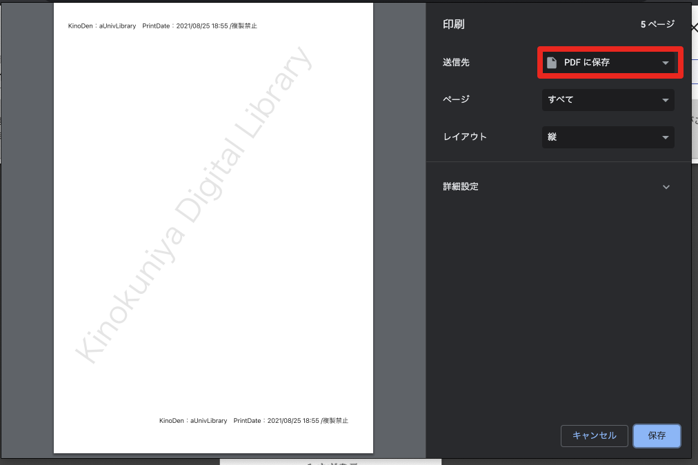 印刷ボタンクリック後に表示されるブラウザの印刷ダイアログにて、送信先を『PDFに保存』に設定します。